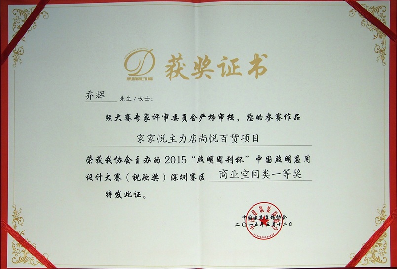 恭祝元本设计主创设计师乔辉,荣获中国建筑装饰协会主办的2015“照明周刊杯”中国照明应用设计大赛(祝融奖)深圳赛区商业空间一等奖。