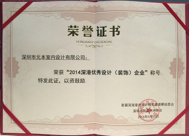 恭祝元本设计荣获“2014深港优秀设计(装饰)企业”称号。